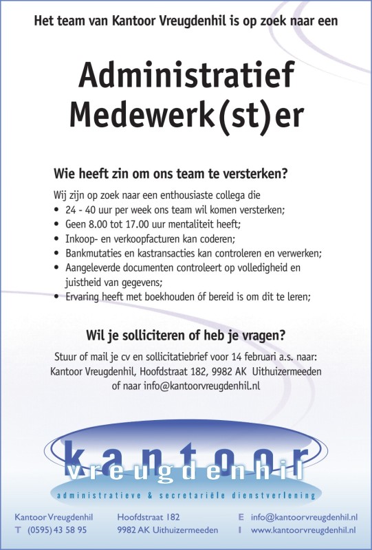 Het team van Kantoor Vreugdenhil is op zoek naar een Administratief Medewerk(st)er.