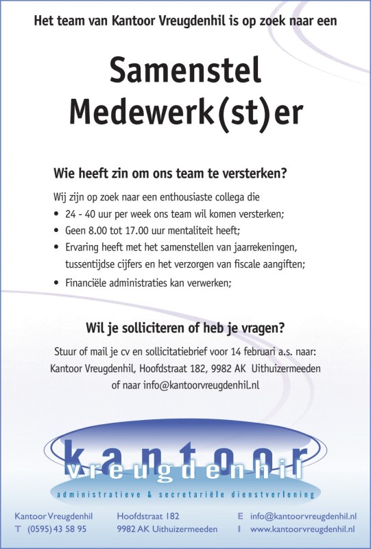 Het team van Kantoor Vreugdenhil is op zoek naar een Samenstel Medewerk(st)er.